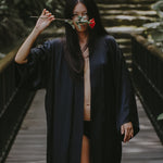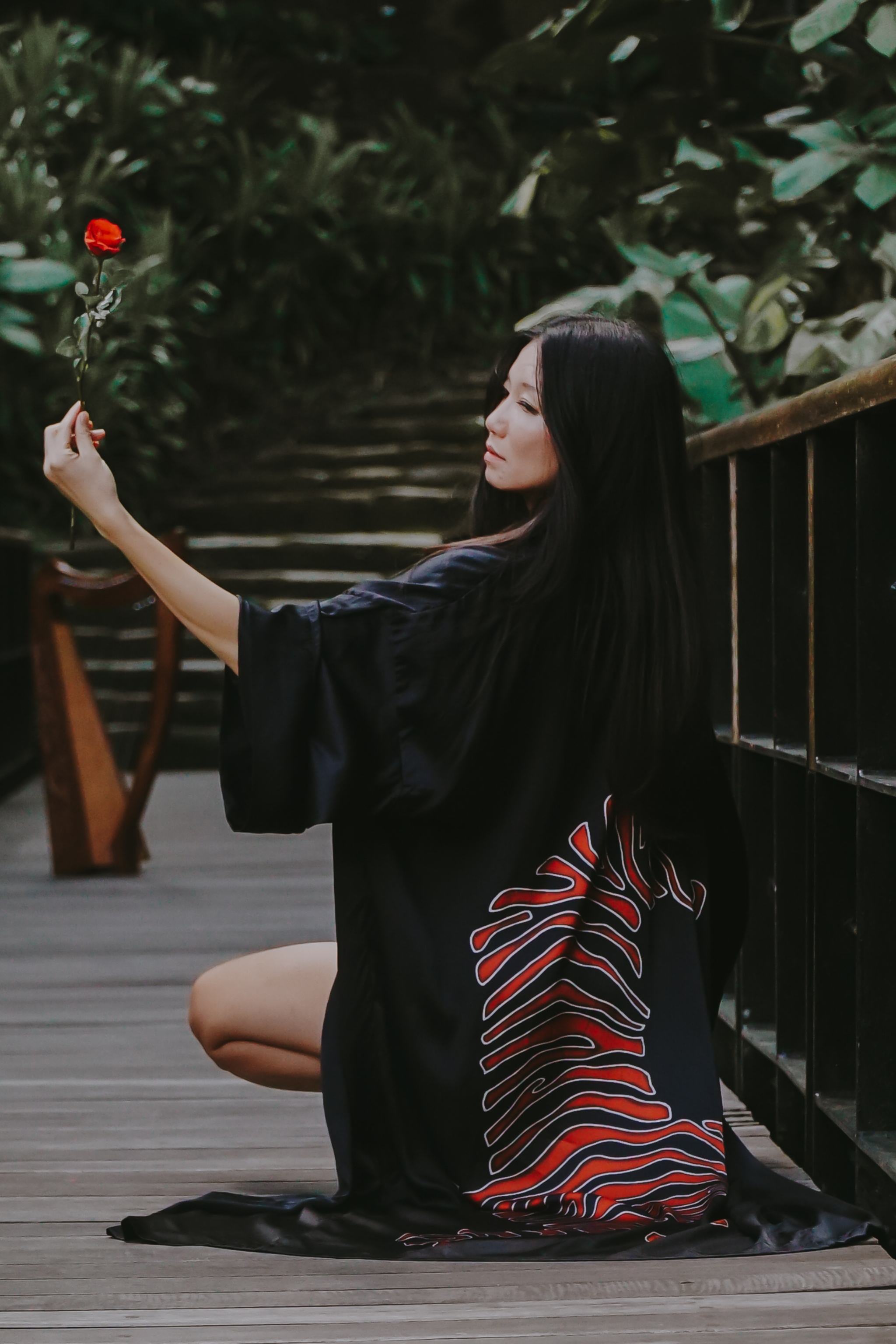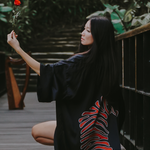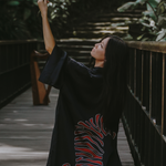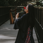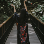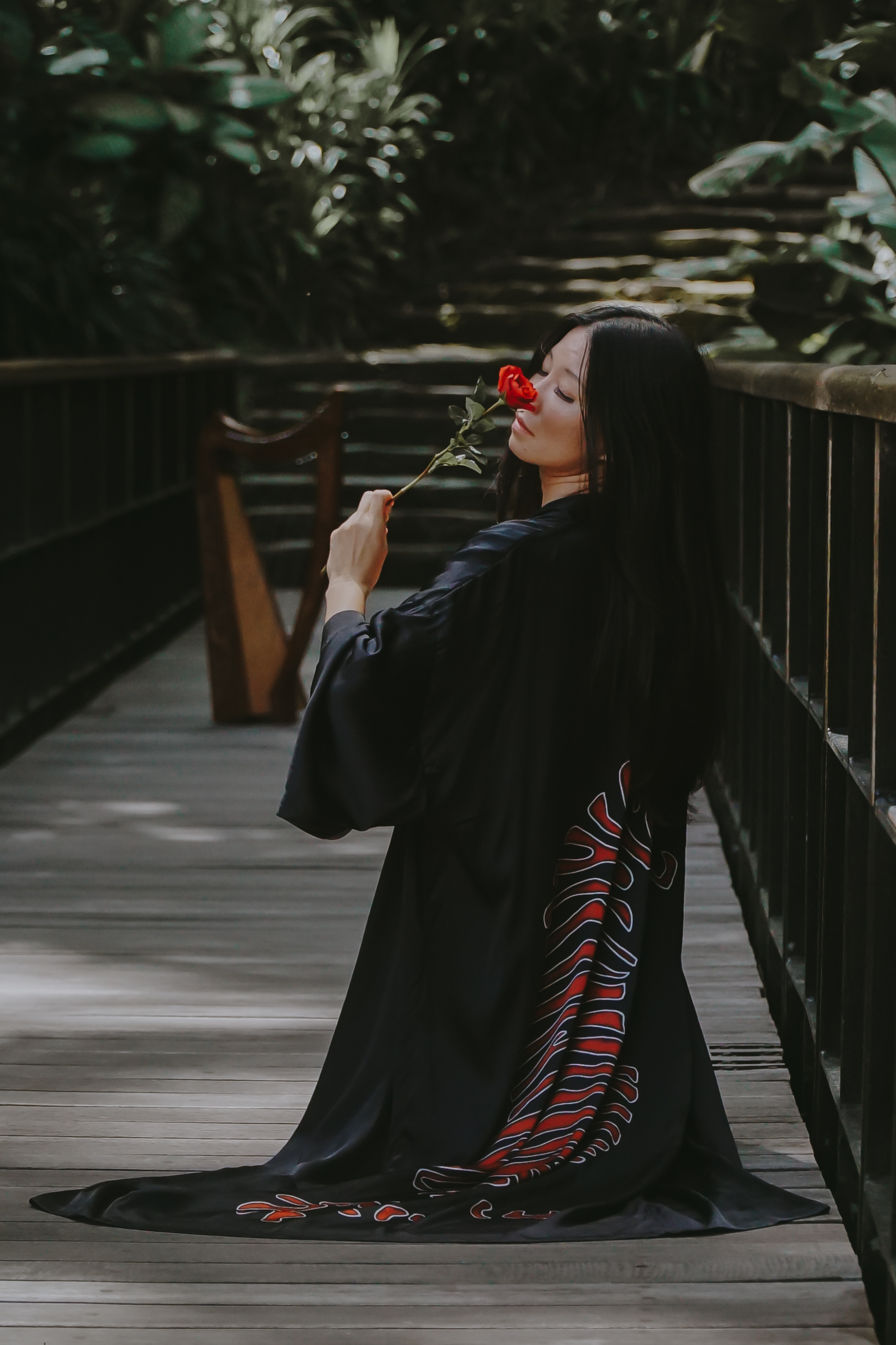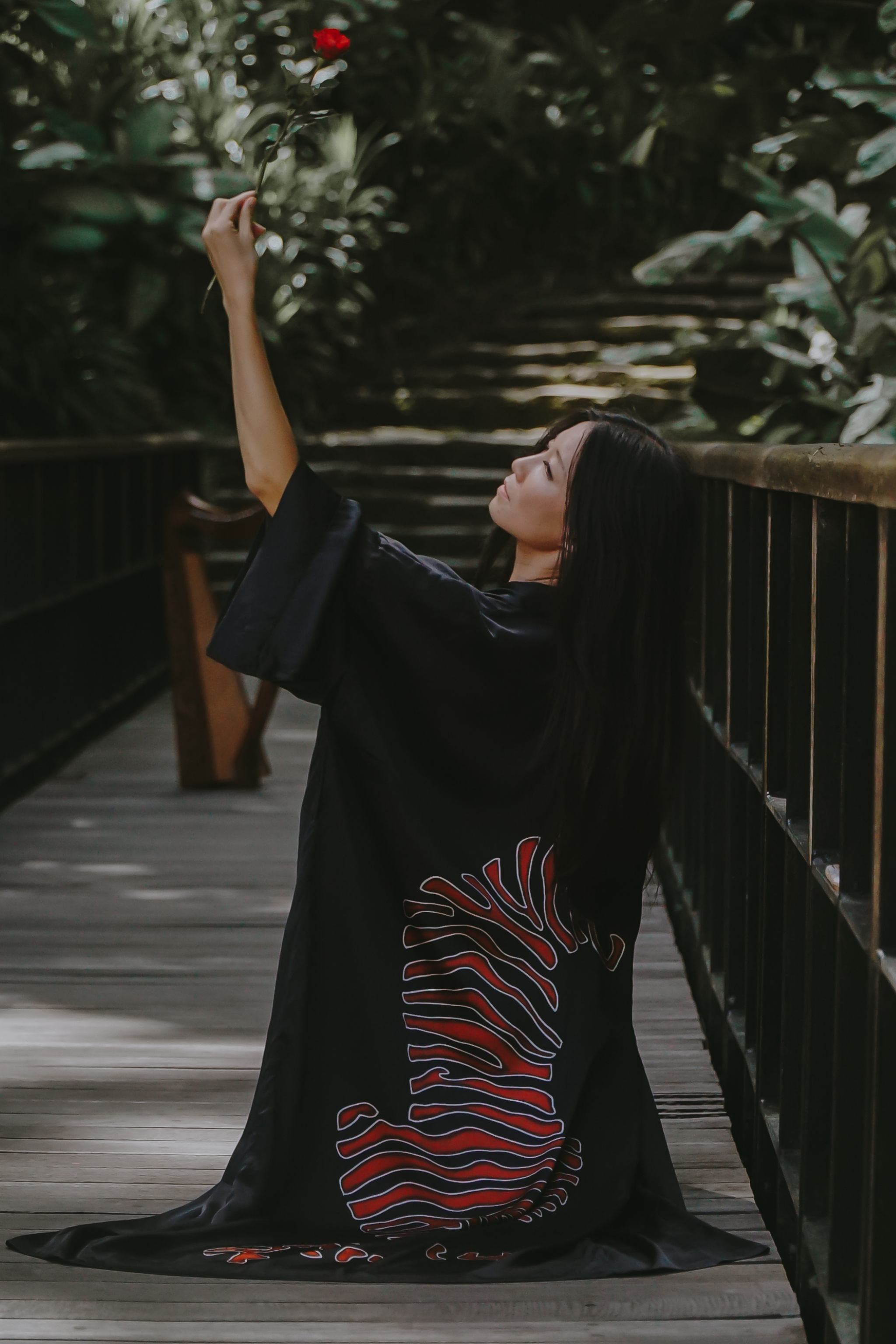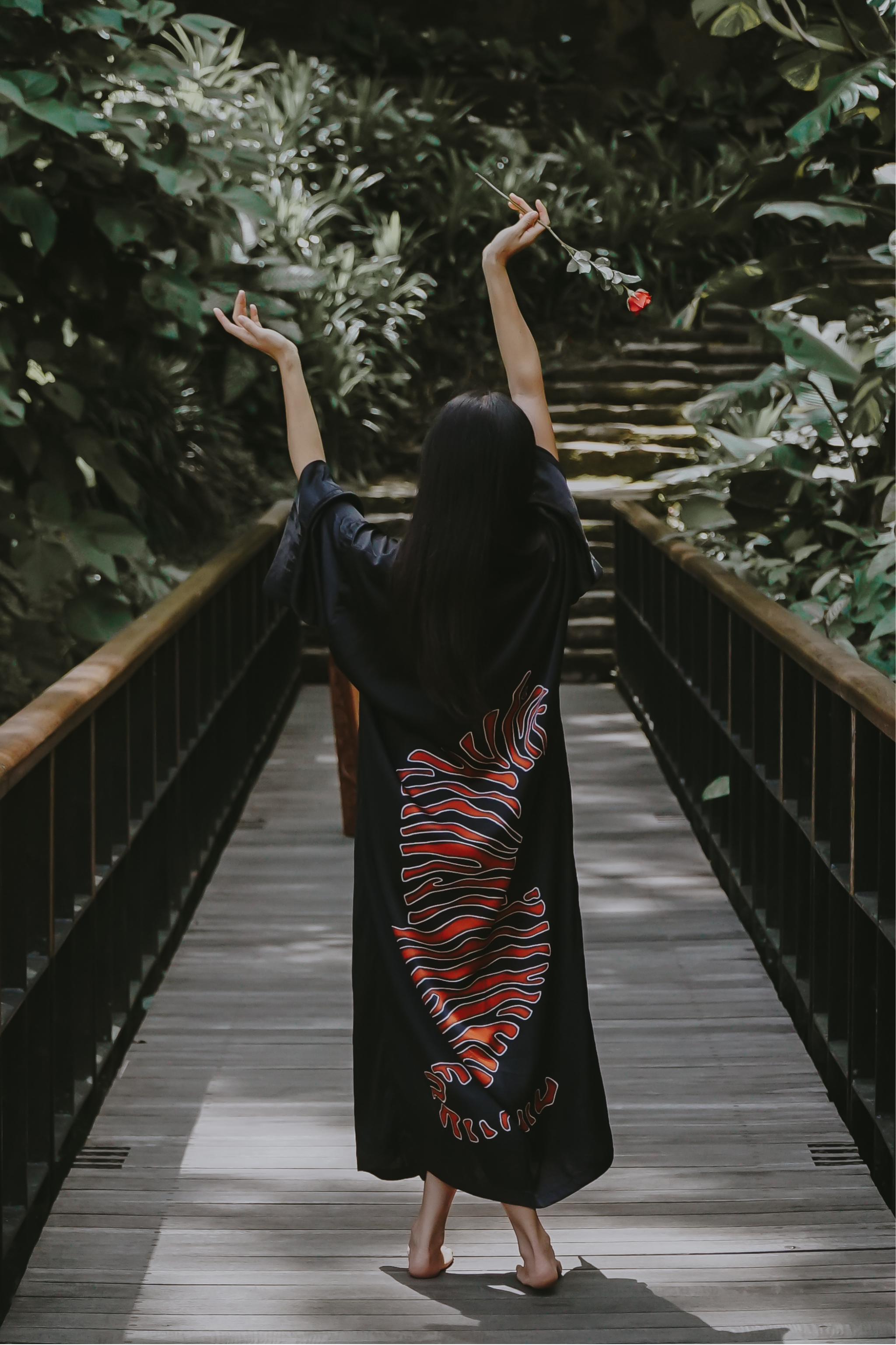 100% silk in deep black, detailed with earthy tones hand-painted by artisans.